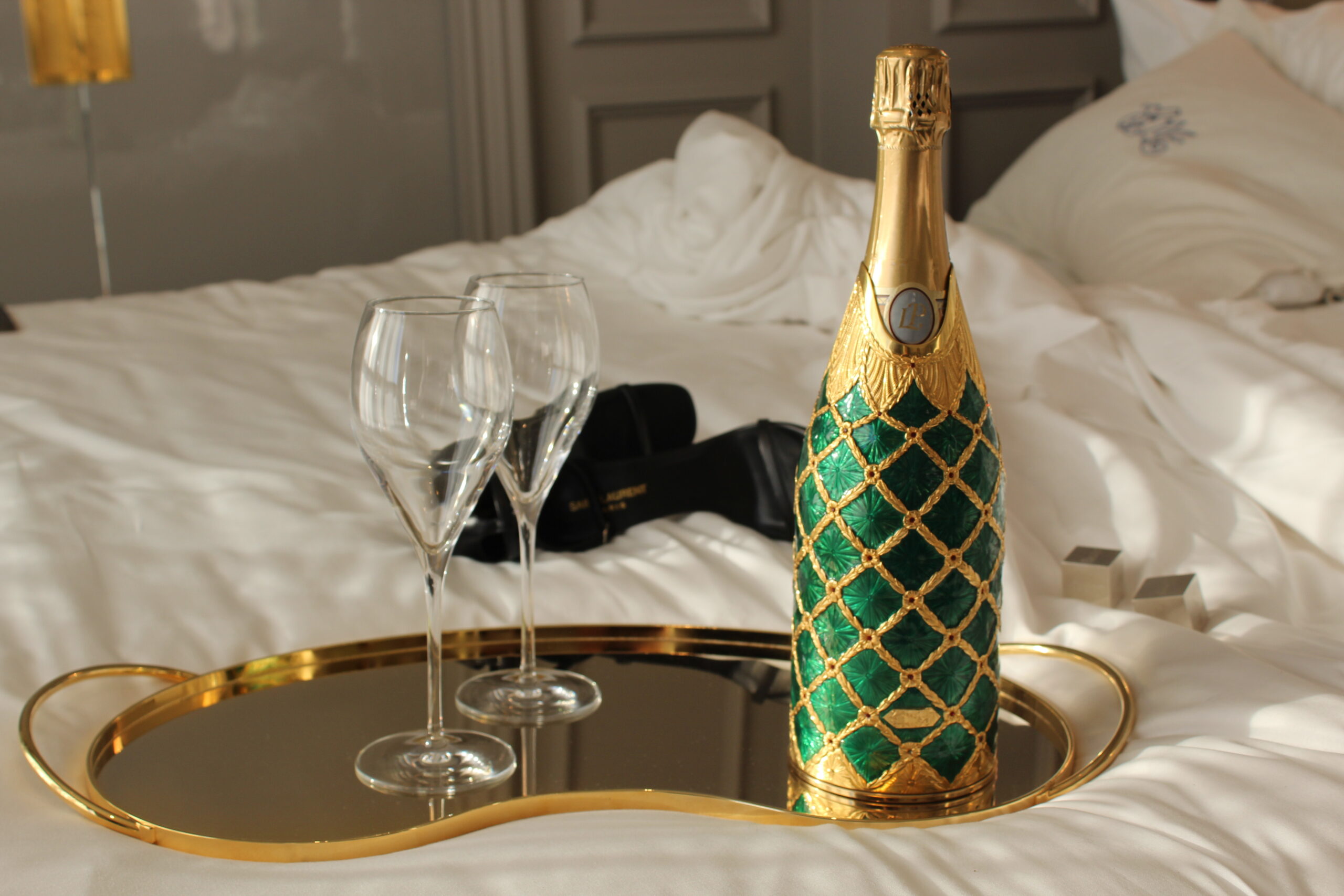 EmeraldThis K-OVER champagne bottle cover is inspired by Fabergรฉ Eggs and symbolizes lifeโs most meaningful moments. Created by artist Stefano Vigni, the cover reflects intricate craftsmanship, taking months to complete and featuring techniques like chasing and chiseling.Order NowcloseBlack